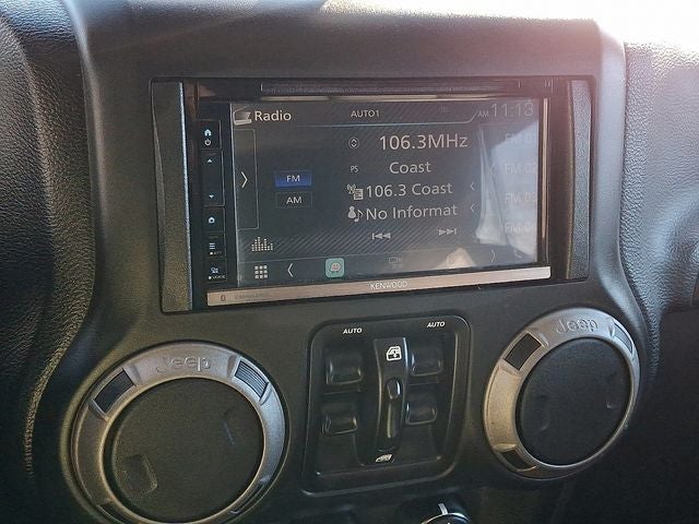 Stepping inside, you'll appreciate the Wrangler's spacious and well-appointed interior, featuring comfortable cloth seats, a leather-wrapped steering wheel, and an auto-dimming rearview mirror with a reading lamp. Stay connected with the Uconnect infotainment system and enjoy the convenience of the power windows and remote keyless entry.